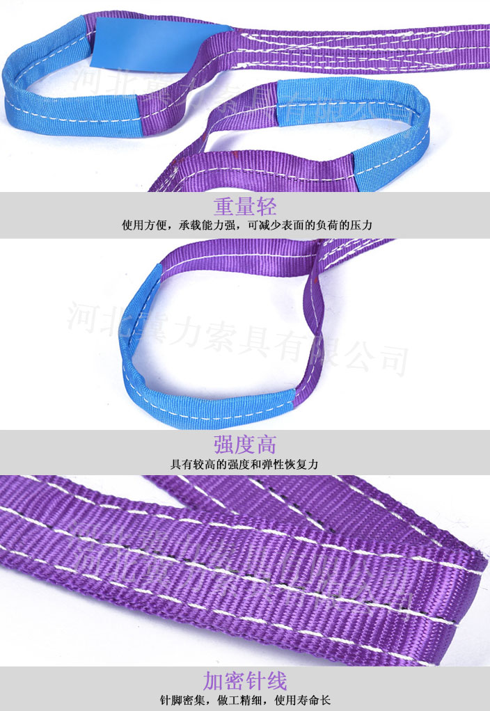 根據(jù)吊裝帶廠家給出的起重吊裝安全載荷破斷記錄中,不難發(fā)現(xiàn)合成纖維半成品織帶是拉力的主宰,但是影響后大破斷力的是吊具的縫合線。成品吊帶縫合線越多,那么它的后破斷力越小。正常安全破斷的斷口永遠是縫合多的部分。因為縫紉機的每一個針腳,都是對吊帶后拉力的損耗。冀力索具根據(jù)多年的生產(chǎn)經(jīng)驗,及具體數(shù)據(jù)表示,常規(guī)吊裝帶所縫合的吊帶針腳應(yīng)控制在10公分內(nèi)10-15針,線跡要橫平豎直。