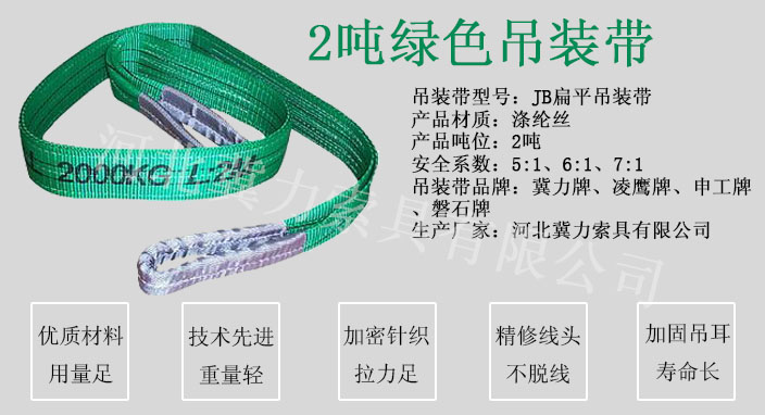 冀力索具生產(chǎn)的扁平吊裝帶采用滌綸絲為原料。滌綸絲具有強(qiáng)度高、彈性好、耐熱性好、吸水性好、耐磨性好、耐光性好、耐腐蝕的優(yōu)勢。并且吊裝帶的兩端使用加強(qiáng)的環(huán)眼來提高強(qiáng)度。