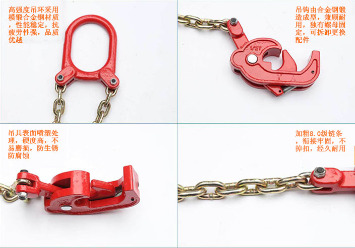 用途:適用于油桶吊鉗,更適用于油桶的豎直吊裝 材質(zhì):采用首鋼低碳###合金剛鍛造 載荷范圍:1噸 鏈條規(guī)格:6×18mm 使用要求:以單只試驗為額定載荷,吊裝作業(yè)時單只使用。 試驗載荷=額定載荷X2 優(yōu)勢:強韌耐久,易操作,吊裝更平穩(wěn),安全性更強。 注意事項: